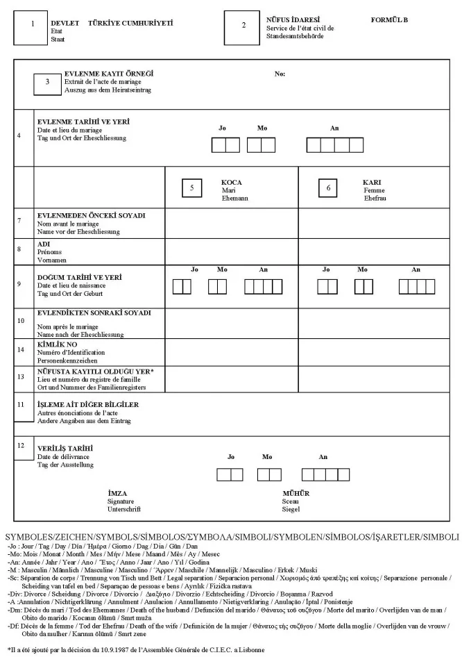 The Formül B International Marriage Certificate is a multilingual official document issued by Turkish civil registry offices. It certifies a marriage registered in Turkey and is commonly required for legal processes such as citizenship, visa applications, family reunification, inheritance matters, and civil registration abroad.